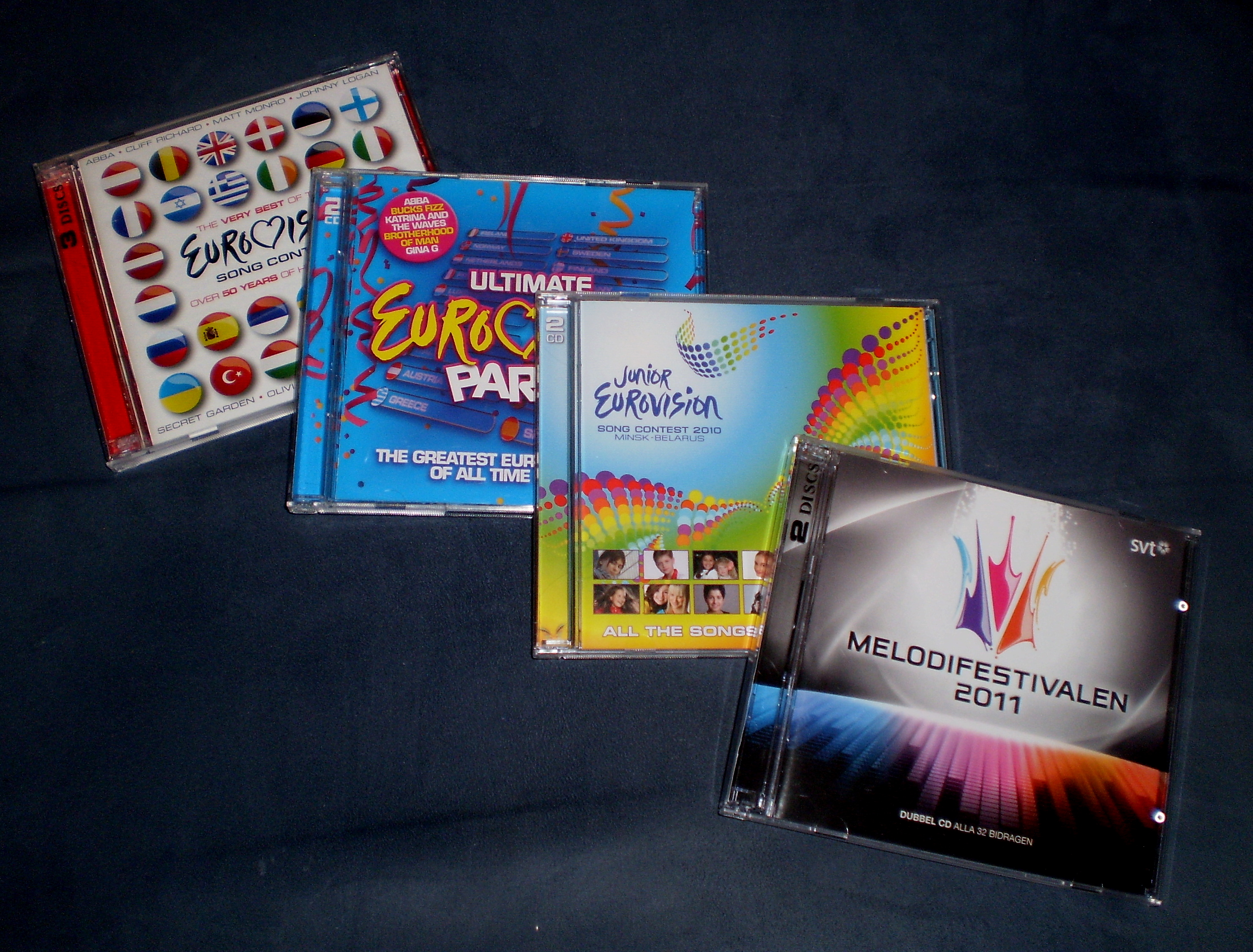 - The ‘other’ CD’s: The first two are: The Very Best of the Eurovision Song Contest from JB Hifi; and Ultimate Eurovision Party from amazon.co.uk. If I had to suggest to you one to get, I’d go for the former, as it features a lot of winners, and all the unforgettables, whereas I think the Party CD originated in the UK, as it’s very biased. It considers James Fox’s Hold On To Our Love a party anthem…still, both are great listens. Lastly, I have: Junior Eurovision 2010 from amazon.co.uk; and Melodifestivalen 2011 from ebay.com.au. I’d never considered buying the JESC or Melodifestivalen albums before these, but I felt both were so strong that I couldn’t go past them.