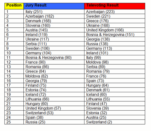 I’m wondering if you’ll be as shocked as I was by some of the entries that both the juries and televoters decided were worthy of their highest points…here’s a brief look at the final stats as seen above.