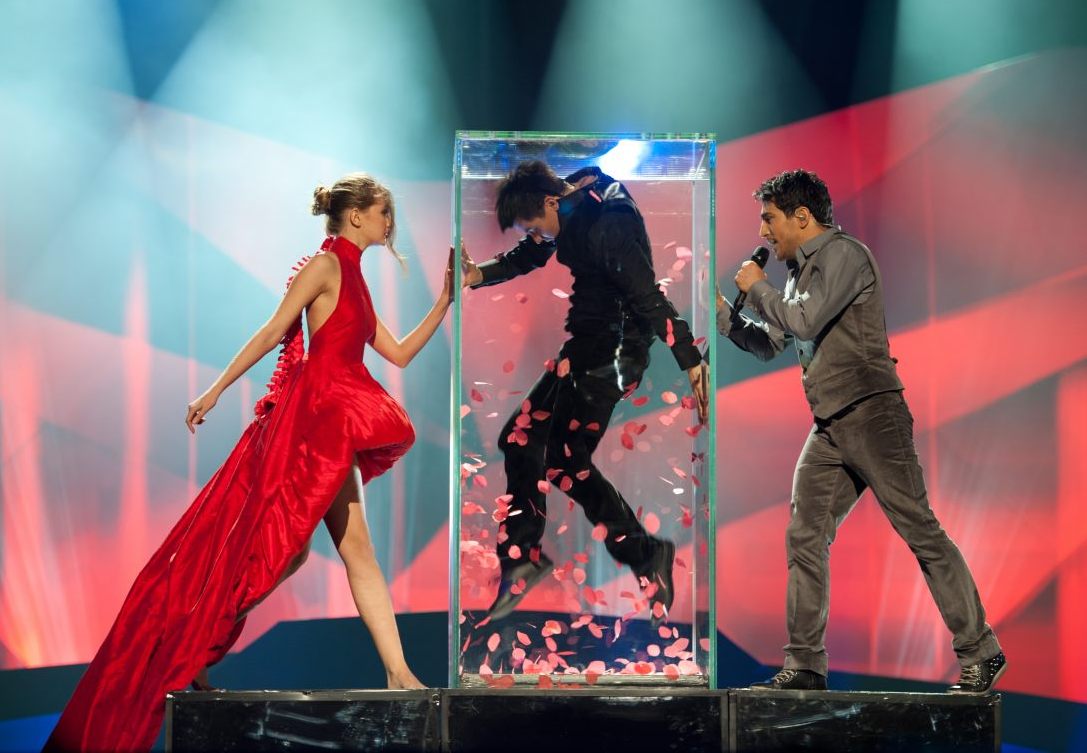 As if It’s My Life wasn’t OTT enough on its own, somebody in the Romanian delegation thought to themselves, ‘you know what we need? A sparkly man-dress with a plunging neckline. And a humongous red sheet. And a bunch of dancers. OH, and a hydraulic platform. Yeah. That’s what we need.’ And then proceeded to share those thoughts with the rest of the delegation who all thought it was a spiffing idea. I’m not so sure, but let’s face it – there’s no point in going subtle for a song like this.